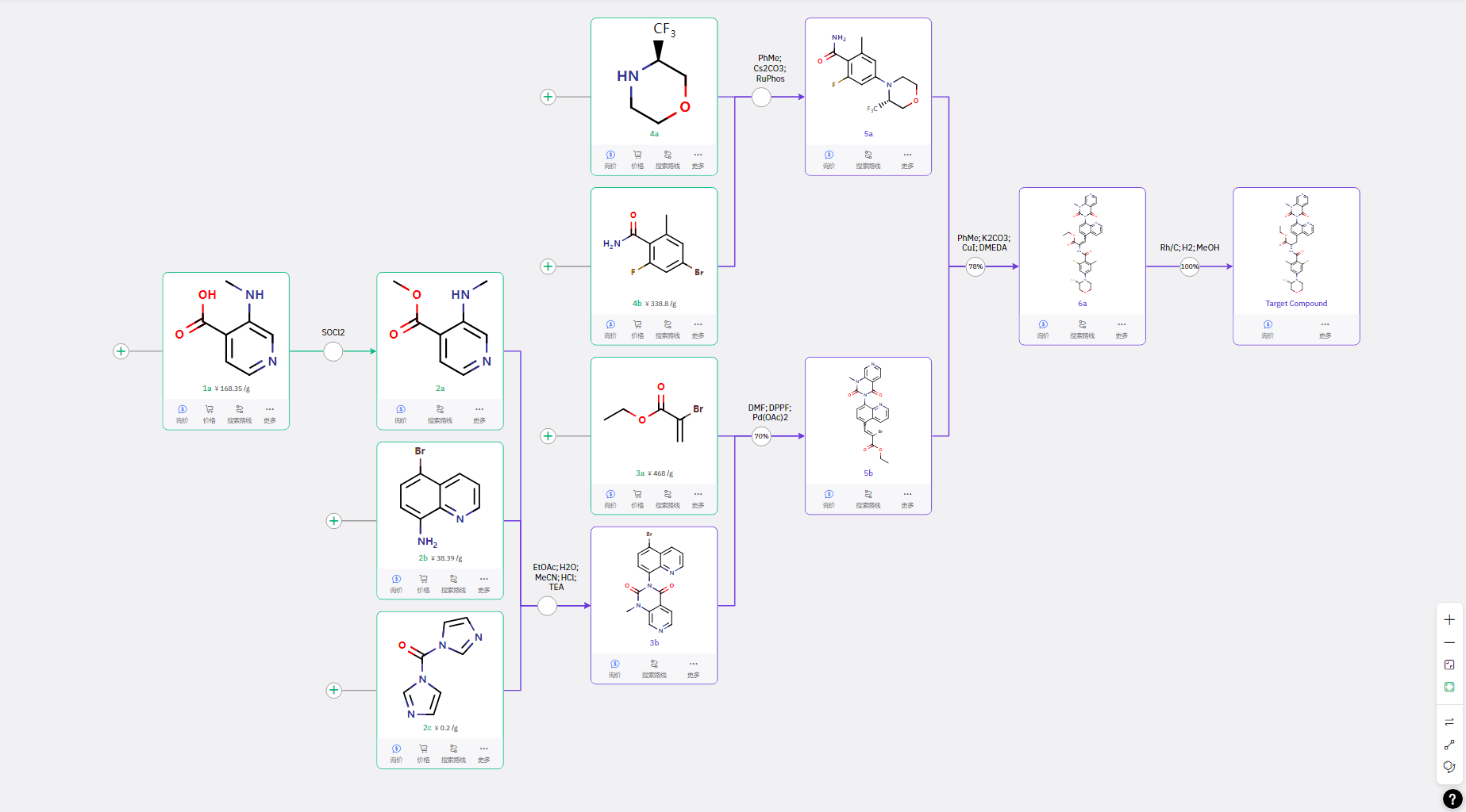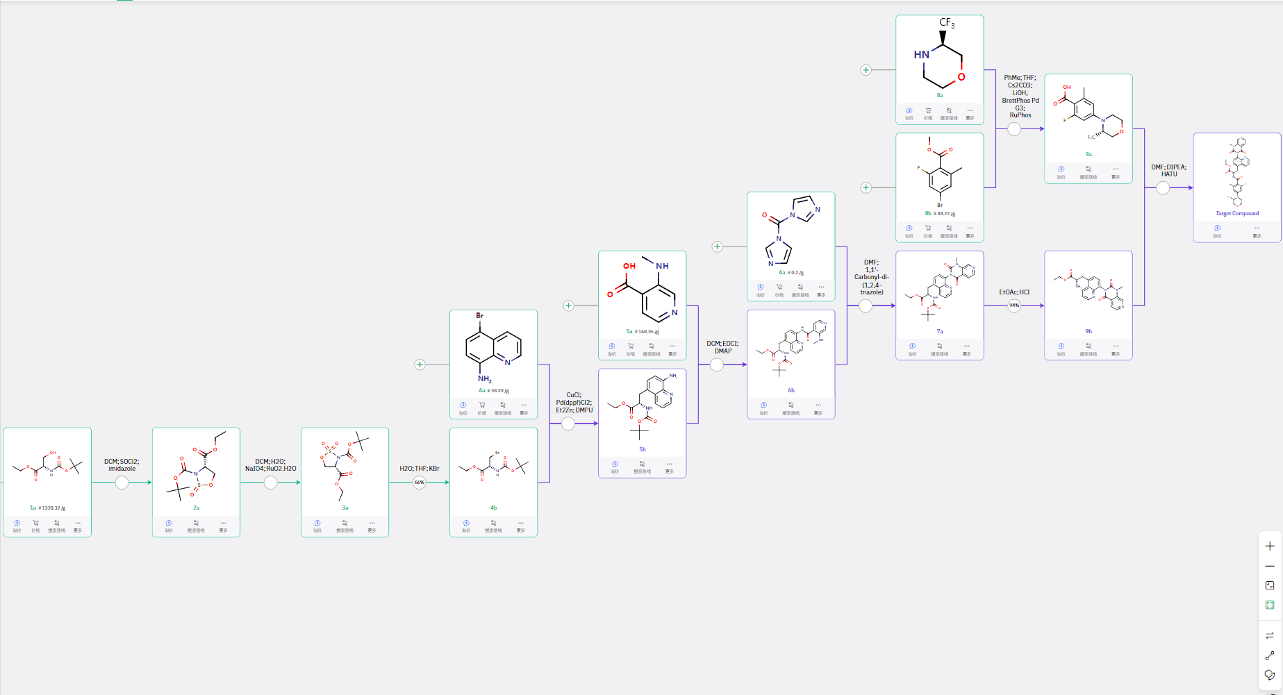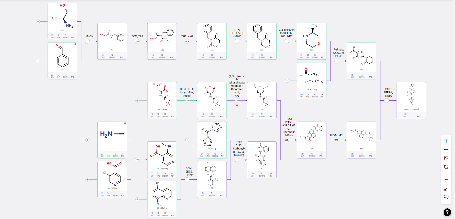 四条合成路线展示了 ChemAIRS 从最简单易得的原料通过完整的路线,遵循合理的反应步骤的先后顺序,官能团的兼容等内在逻辑最终合成目标产物的过程。用户可以通观全局也可以通过设置或调整中间体为原料以减少合成步骤,规划项目安排,缩短合成周期。在药物分子结构日益复杂的今天,AI 辅助路线合成不仅加速了候选化合物的发现,也为规避专利壁垒、优化工艺路线提供了全新可能。