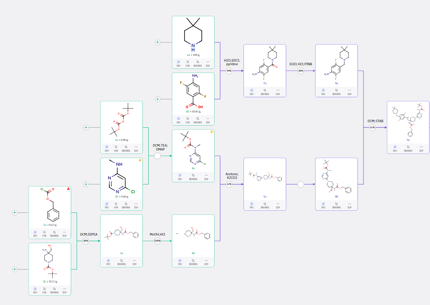 路线二创新采用 “先构建核心骨架,再对接中间体” 的思路:中间体 1a 与 1b 经缩合、脱 Cbz 保护后,直接与 3a 反应得到 4a,经羟基卤代后完成分子内关环,脱保护后再与 8a 进行分子间 C-N 偶联。通过优先构建螺环结构,有效降低了后续反应的空间位阻,显著提升了合成可行性。