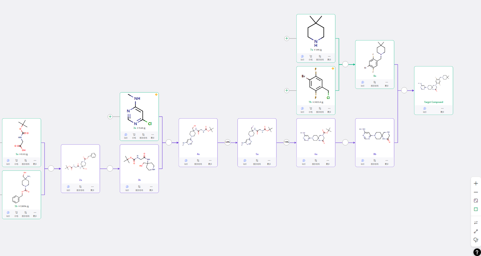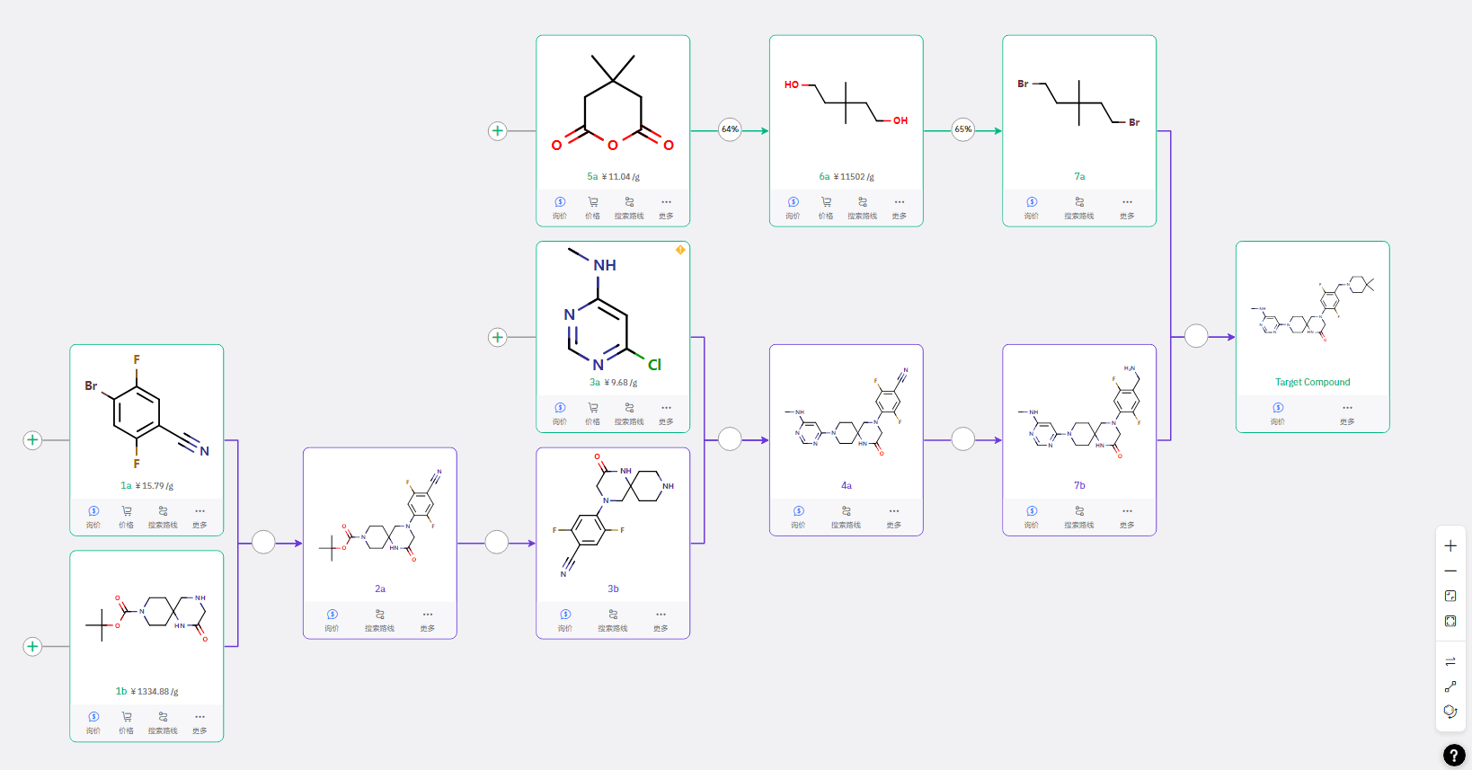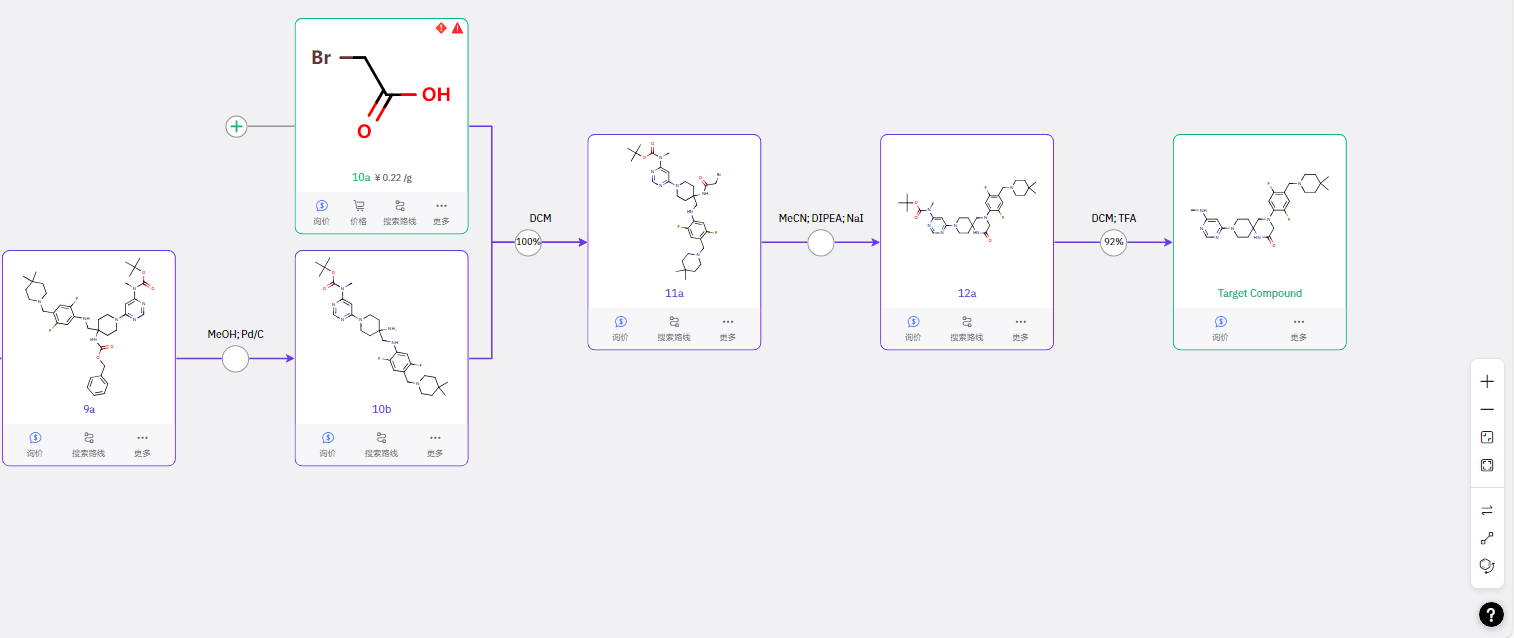 一款潜力药物的落地,离不开高效、可行的合成路线支撑。基于大数据技术,ChemAIRS 成功抓取了该活性化合物的专利文献报道路线,并创新性地设计出三条不同单元结构引入顺序的合成方案。