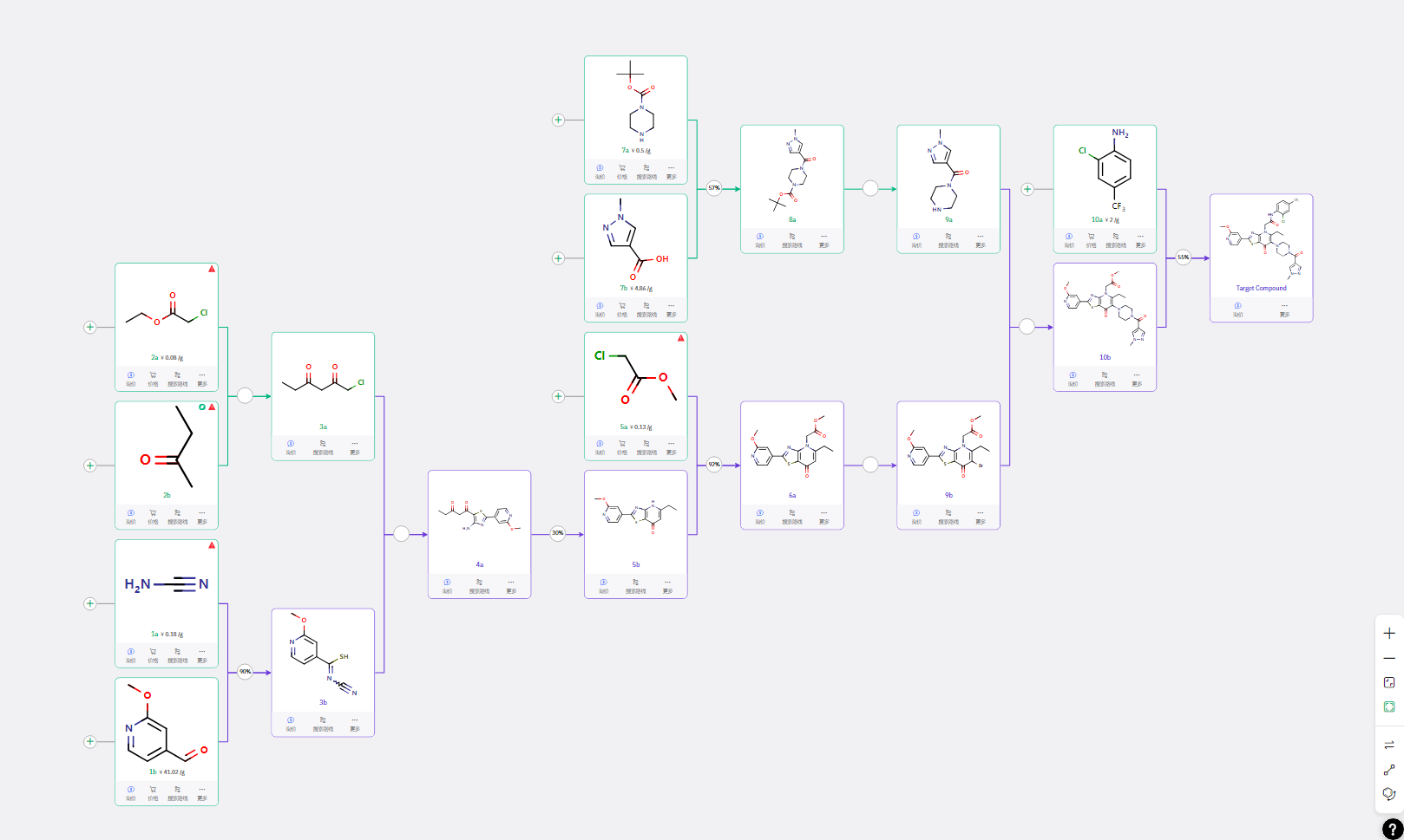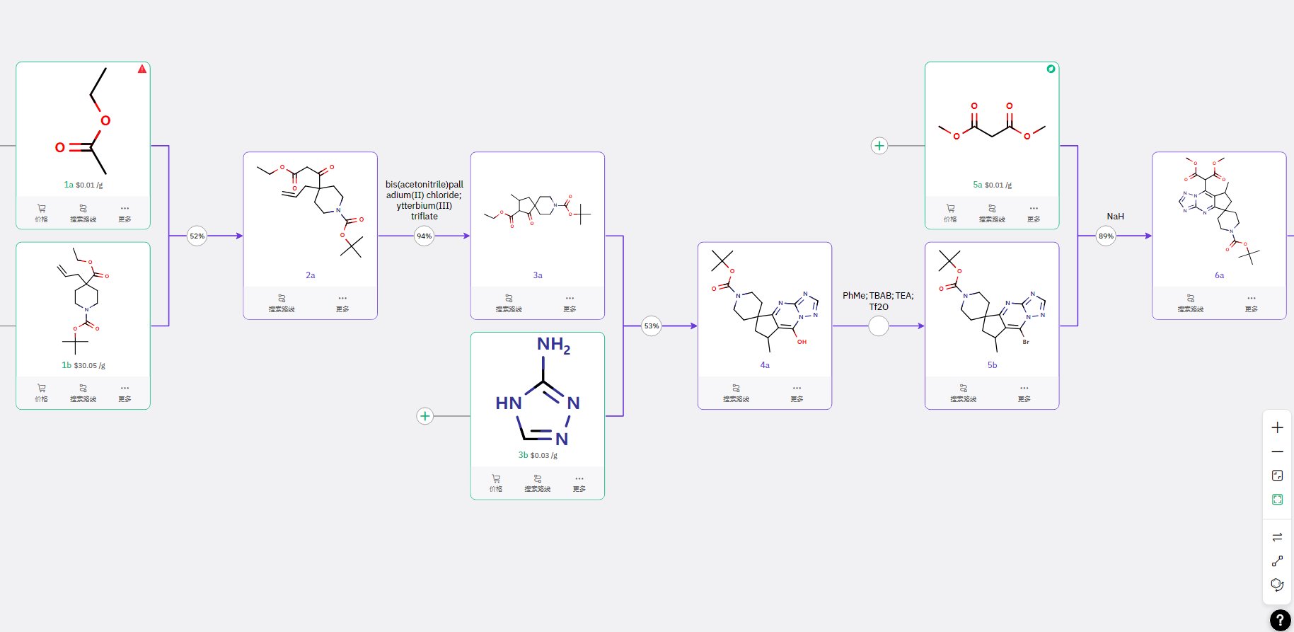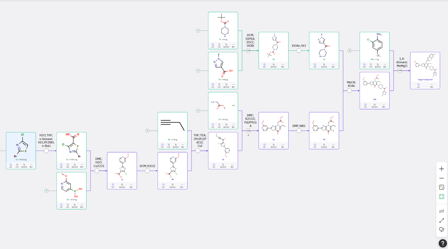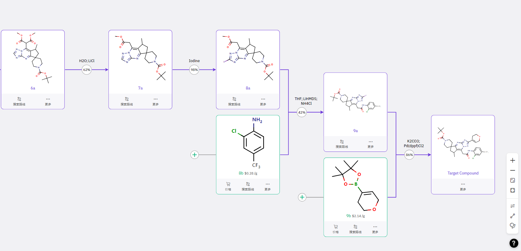 通过 Claisen 缩合、分子内关环构建核心结构 4a,在中性条件下完成溴代、碳链引入,最终经 胺酯交换、Suzuki 偶联,完成目标产物合成。ChemAIRS 基于分子的结构差异,提供了合理可行的执行路线。