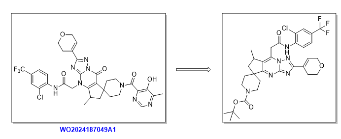 专利 WO2024187049 中报道了类似活性的化合物,单分子结构的细微差异有时候需要完全不同的设计策略。基于该分子的结构,给出了右侧潜在中间体的结构。