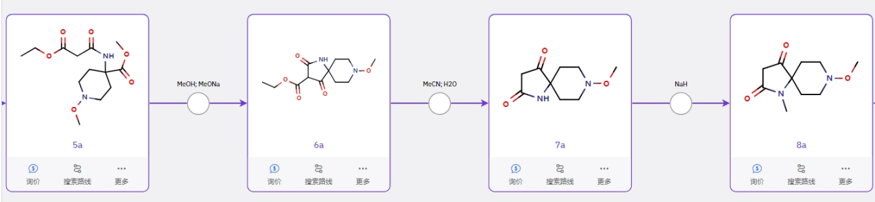 平行合成两个关键片段(8a 和 8b),再通过胺基交换 与分子内 Dieckmann 缩合反应及与氯甲酸乙酯反应得到目标产物。路线二是典型的汇聚式路线,从基础原料通过经典增长碳链和关环策略,温和的反应条件完成转化,适合大规模快速制备目标化合物。