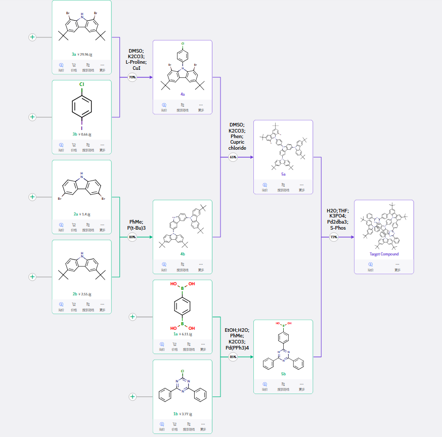 采用汇聚式策略,分别通过Ullmann C-N偶联和Buchwald C-N 偶联得到关键中间体,再经偶联反应高效组装目标产物。