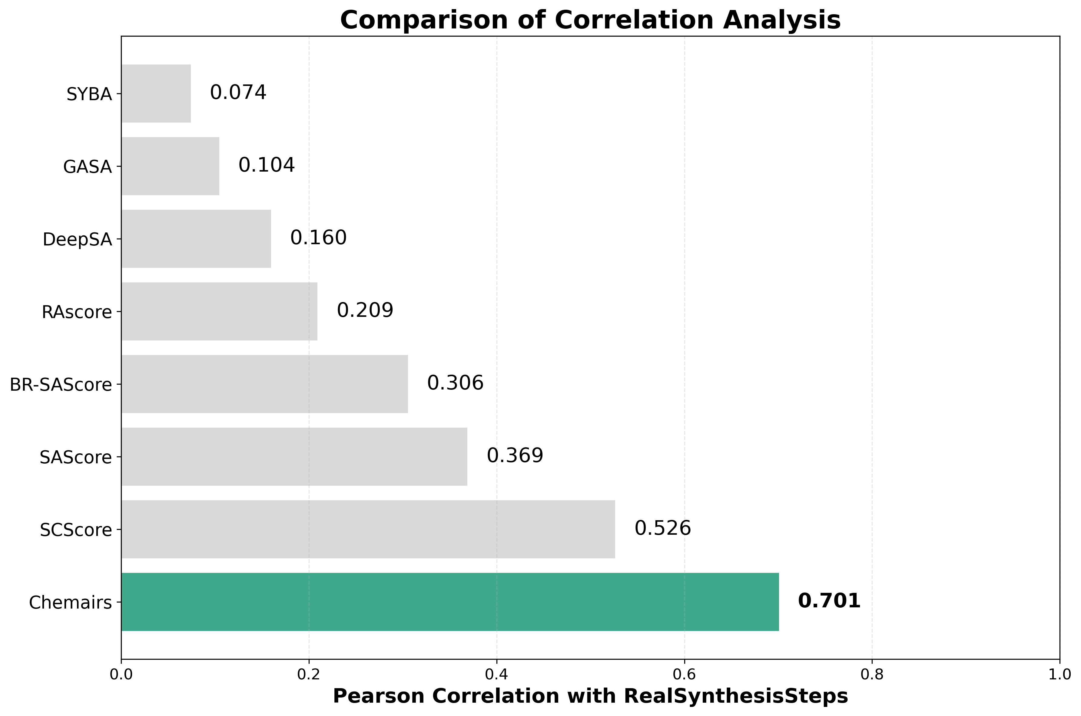 结果显示,ChemAIRS 极速模式的预测值,和真实合成步数的皮尔森相关系数是最高的,展现出卓越的预测准确性。SC Score 和经典SA Score 紧随其后,表现也不错。